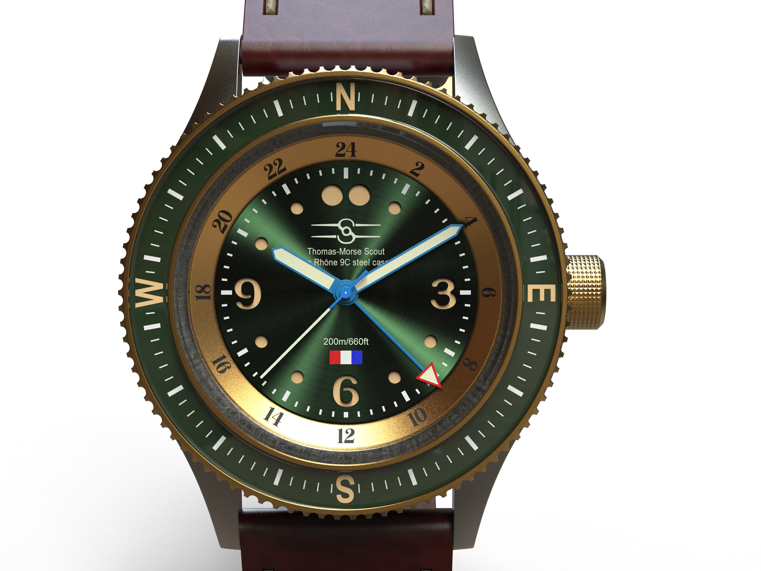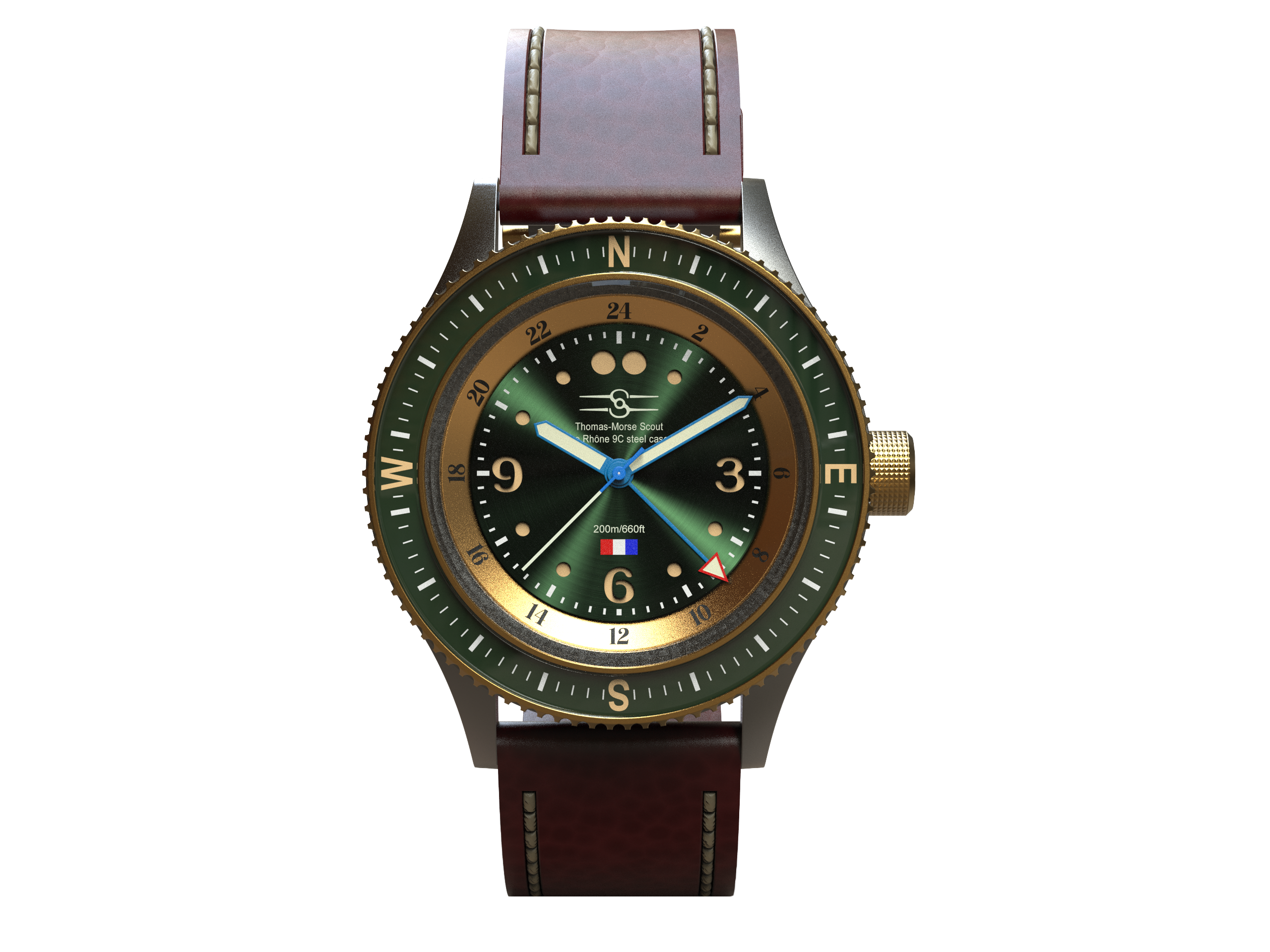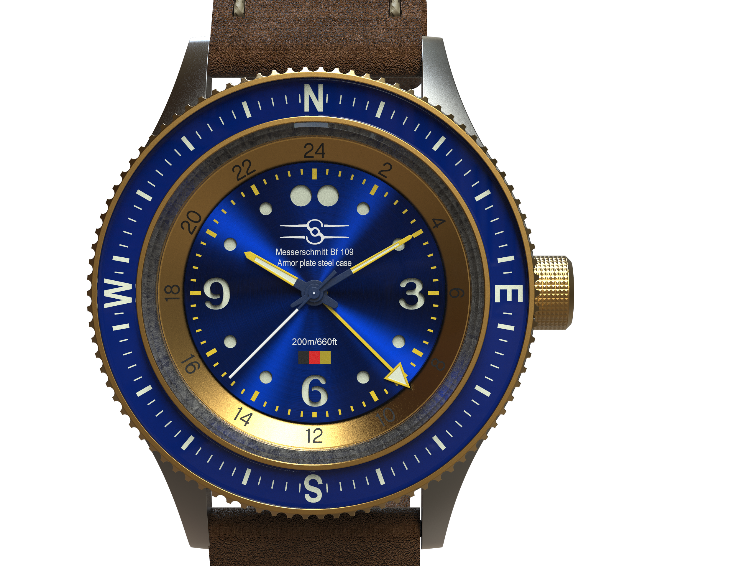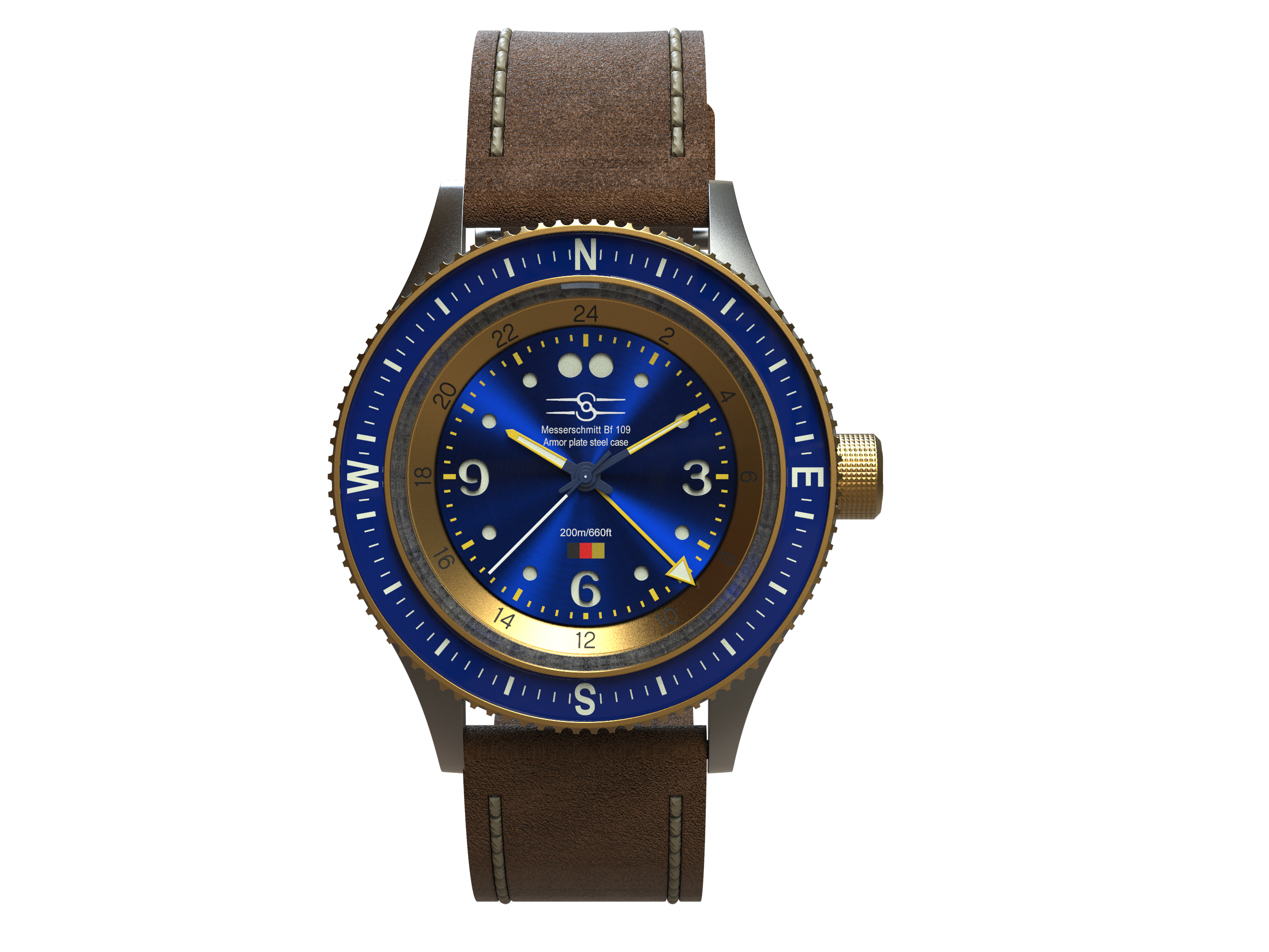 Sopwith’s Bf 109 edition of the Aero Marquis is made directly from one of history’s iconic fighters. The steel used in the making of the in-house case was once the bulletproof rear headrest and armored window frame of Germany’s famed pursuit plane.
